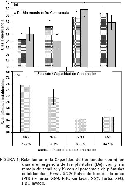 El menor tiempo a la emergencia de las plántulas y el mayor porcentaje de establecimiento de las mismas se obtiene en sustratos con una capacidad de retención de humedad (capacidad de contenedor) de 75 y 82%.