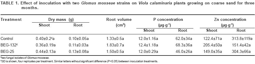 Colonization of V. calaminaria roots was 19% by BEG132 and 47% by BEG25. Besides this difference in fungal colonization, after three months of fungal inoculation, no changes in plant growth were observed between AMF treatments. Neither shoot and root dry masses nor P and Zn concentrations in shoots and root parts were significantly (P<0.05) different between the control and the two AMF treatments (Table 1). This suggested that Viola calaminaria did not behave as a mycotrophic plant in these experimental conditions. However, it would be interesting to know whether, under field conditions, AMF might be useful to V. calaminaria and other metallophytes growing under conditions of restricted, low essential nutrient concentrations or stress. These fungi may be important in multiple responses of their host in addition to plant growth alone, which Whitfield et al. (2004) mentioned.