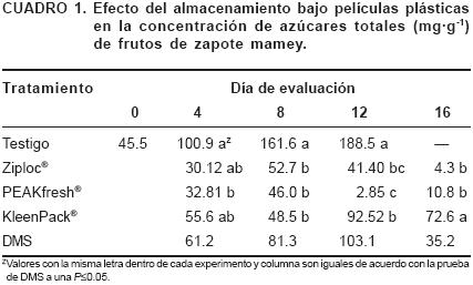Los fenoles totales disminuyeron durante la maduración (Cuadro 5); esta situación se ha reportado antes y se ha relacionado con la reducción en la astringencia (Alia et al., 2005b). Los frutos almacenados en KleenPack® y PEAKfresh® mostraron este comportamiento, obteniendo los valores menores después de 16 días, en tanto que los frutos almacenados en Ziploc® no mostraron cambios importantes.