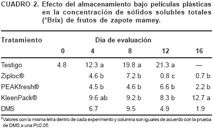 El almacenamiento en la película plástica de KleenPack®, retrasó la acumulación de sólidos solubles; después de 16 días los valores fueron similares a los frutos testigo en madurez de consumo (Cuadro 2). En contraste, los frutos almacenados en PEAKfresh® y Ziploc® presentaron acumulación baja de sólidos solubles (entre 85 y 70%) menos que en los frutos testigo en la madurez de consumo, lo cual es sintomático de una afectación de la maduración por estas películas.