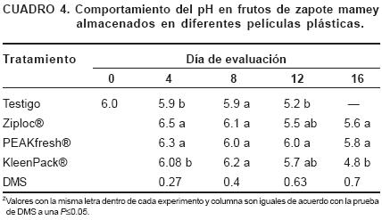 El pH de los frutos usados como testigo disminuyó de 6.0 a 5.2 durante la maduración (Cuadro 4). Sin embargo, estos cambios fueron menores a los que ocurren en frutos como chirimoya (Annona cherimolla Mill.), donde se reportan variaciones hasta de dos unidades (Gutiérrez et al., 1994). El control del pH es dependiente de la compartimentación intracelular. Durante la maduración existe una progresiva acumulación de ácidos orgánicos los cuales aumentan por la degradación de almidón en la vacuola (Gutiérrez et al., 1994) y este hecho permite explicar el comportamiento observado. También es probable tener una afectación por la maduración anormal en los frutos almacenados en Ziploc® y PEAKfresh® (Cuadro 4), lo que no ocurrió en los frutos almacenados en KleenPack®, que maduraron después de 16 días.