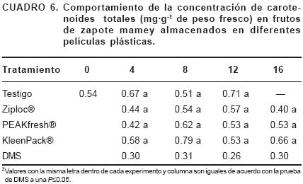 Según AliaTejacal et al. (2002), durante la maduración los carotenoides totales de la pulpa se incrementan en concomitancia con una disminución del ángulo de matiz. En el presente trabajo estos pigmentos aumentaron en los frutos testigo de 0.54 mg·g1 en la madurez fisiológica a 0.71 mg·g1 en la madurez de consumo. La diferencia en el comportamiento probablemente se atribuye a la diversidad genética que se encuentra en el lugar de estudio. Por otro lado, la utilización de películas plásticas no afectó significativamente el comportamiento de los carotenoides totales (Cuadro 6).