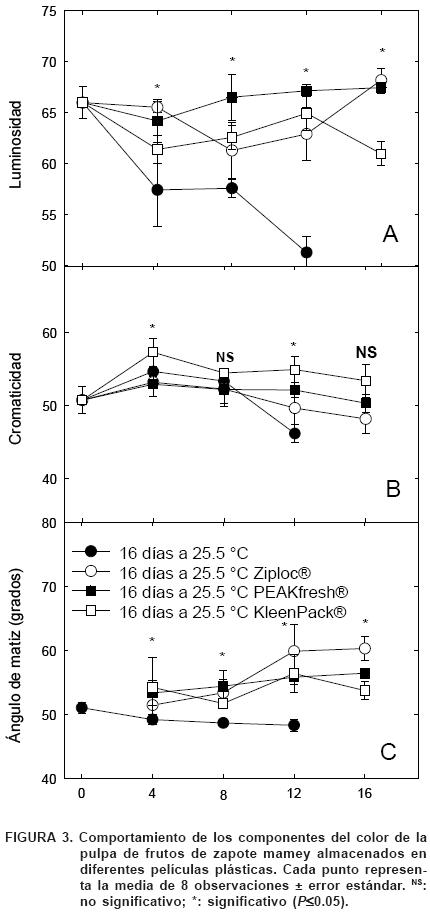 La cromaticidad de la pulpa de los frutos de zapote mamey mostró pocos cambios durante la postcosecha de los frutos testigo (Figura 3 B), tampoco se detectó efecto en esta variable por las películas plásticas evaluadas (Figura 3 B). Al respecto, DíazPérez et al. (2000) indicaron que existe poca variación de la cromaticidad durante la maduración de los frutos de zapote mamey. Con relación al ángulo de matiz, en los frutos testigo en madurez de consumo se ubicó entre rojo y amarillo (H*= 48.2°). Diversos autores han indicado que el ángulo matiz de la pulpa de zapote mamey en madurez de consumo, fluctúa entre 44 y 55° (DíazPérez et al., 2000; AliaTejacal et al., 2002). Recientemente, GaonaGarcía et al. (2008) encontraron en materiales de la región de estudio valores entre 61.0 y 81.1°, lo que indica gran variación de tonalidades en la pulpa de estos frutos, y se cree que a esto se debe la variación observada en el presente estudio. De acuerdo con DíazPérez et al. (2000) y AliaTejacal et al. (2002), el ángulo de matiz no se modifica en forma importante con la maduración, lo cual fue consistente con los resultados de este estudio (Figura 3 C). Por otro lado, se observó el efecto del tipo de película usada. Los casos de Ziploc® y PEAKfresh® no causaron cambios significativos respecto a los valores iniciales y fueron diferentes de aquellos frutos almacenados con KleenPack® (Figura 3 C) después de 16 días.
