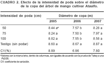 Los resultados mostraron que antes de la aplicación de los tratamientos de poda (2005), la altura de los árboles fue similar (Cuadro 1) ya que no se detectaron diferencias estadísticas entre los tratamientos, lo que indica una selección adecuada de los árboles y del diseño experimental utilizado. Después del primero (2006) y segundo ciclo (2007) productivo, la reducción de la altura de los árboles fue notoria, ya que los árboles podados tuvieron menos altura que los testigos (sin poda); aunque sólo se detectaron diferencias estadísticas en el segundo año. Respecto al diámetro de la copa; antes de la aplicación de los tratamientos de poda (2005) fue similar en los árboles seleccionados ya que el análisis estadístico no detectó diferencias significativas entre ellos. Es notorio que en los años posteriores a la poda, (2006 y 2007) los árboles podados tienen menor diámetro de copa en comparación con los testigos (sin podar); aunque estadísticamente sólo se detectaron diferencias en el primer año (Cuadro 2). Esto indica que mediante la poda es posible controlar tanto la altura, como el diámetro de la copa y por lo tanto el tamaño de los árboles, aspecto importante para un manejo adecuado de las plantaciones de mango. Controlar la altura del árbol es importante porque permite un control más eficiente de las plagas y enfermedades y disminuye el sombreo entre árboles contiguos, de hecho es recomendable que la altura no exceda del 70% (Khone, 1998) u 80% de la distancia de plantación (Gil et al., 1998) y que las copas no se junten, lo cual es fundamental tanto para un control sanitario adecuado como para tener una producción abundante.