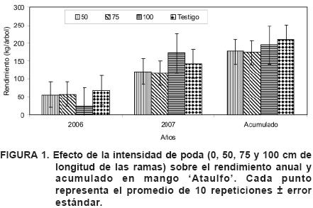 Particular atención merece el tratamiento de poda de 100 cm, que el primer año produjo tan solo 22.95 kg·árbol1 que fue el más bajo, pero en el segundo ciclo de cultivo, tuvo el rendimiento más alto con 172.09 kg·árbol1, es decir que incrementó su producción alrededor de siete veces el segundo año en comparación con el primero. Este parece indicar que el bajo rendimiento del primer año (año alternante) fue inducido aún más por la poda fuerte que se realizó, lo que favoreció un crecimiento vegetativo abundante a expensas de la floración y la fructificación, ya que estos dos procesos son antagónicos (PérezBarraza y VázquezValdivia, 2006); no obstante, esto posiblemente le haya permitido al árbol almacenar una cantidad suficiente de reservas que al siguiente ciclo se manifestó en una excelente producción de frutos, ya que el contenido de reservas está directamente relacionado con el rendimiento (Van der Walt et al., 1993). Por otro lado se ha indicado que en mango, un balance adecuado entre crecimiento vegetativo y floración parece ser lo ideal para evitar el fenómeno de alternancia (Singh, 1960). El rendimiento acumulado de las dos cosechas tampoco fue afectado por la intensidad de poda (Figura 1).