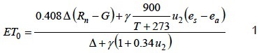 donde Rn es la radiación neta en la superficie del cultivo (MJ·m-2·d-1); G es la densidad de flujo de calor del suelo (MJ·m-2 d-1); 7 es la temperatura media diaria del aire (°C); u2 es la velocidad del viento a 2 m de altura (m·s-1); es es la presión de vapor a saturación (kPa); ea es la presión de vapor actual (kPa); Δ es la pendiente de la curva de presión de vapor (kPa °C-1) y γ es la constante psicrométrica (kPa °C-1).