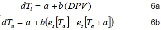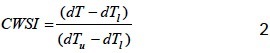 donde dT es la diferencia medida entre la temperatura del aire y del cultivo; dTu es el límite superior de las temperaturas del aire menos la temperatura del follaje (cultivo sin transpiración); y dTi es el límite inferior de las temperaturas del aire menos la temperatura del follaje (cultivo bien regado).