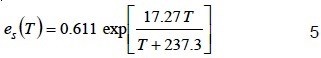 La presión de vapor de agua a saturación (es) es la máxima cantidad de vapor de agua que puede contener el aire a una temperatura (T en °C) dada y se calculó con la ecuación 5 (Allen et al., 1998):