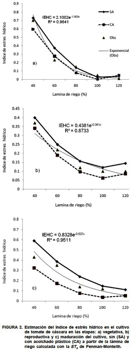La relación entre el índice de estrés hídrico y la lámina de riego es negativa y exponencial, a medida que la lámina de riego aumenta el IEHC disminuye hasta llegar a 0 cuando se aplica el 100 o 120 % de la ET0. Las diferencias entre con y sin acolchado plástico, en las diferentes etapas fenológicas, indican que el valor de IEHC con acolchado es menor que sin acolchado plástico. Esto se debe principalmente a la reducción de la evaporación del suelo en los tratamientos con plásticos. Al respecto, Simsek et al. (2005) observaron que cuando disminuye la lámina de riego, la tasa de transpiración del cultivo también disminuye dando por resultado aumentos de temperaturas del cultivo y del IEHC; esto resulta en una disminución del rendimiento del cultivo.