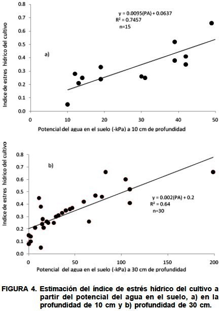 Con el propósito de encontrar una relación entre el índice de estrés y el rendimiento del cultivo, se hicieron análisis de regresión. Así fue posible seleccionar las funciones con mayores coeficientes de correlación (r) y determinación (r2). Para relacionar el índice de estrés hídrico con el potencial del agua del suelo se colocaron sensores watermark con medidor electrónico de lectura digital entre 0 y 200 kPa a dos profundidades: 10 y 30 cm por tratamiento. Las lecturas se hicieron diariamente antes de la aplicación del riego entre las 8 y 9 horas.