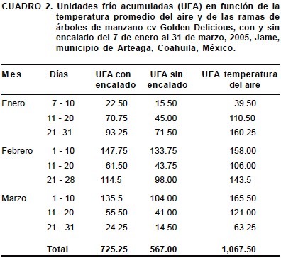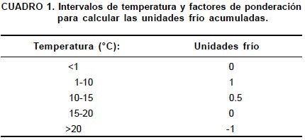 A partir de los modelos de Erez y Lavee (1971) y el de Shaltout y Unrath (1983), se definieron cinco intervalos de temperatura y sus correspondientes factores de ponderación, para calcular las unidades frío acumuladas (UFA), utilizando los valores promedio de cada hora de temperatura del aire y temperatura interna de las ramas de los árboles con y sin encalado medidos como se describió en el párrafo anterior (Cuadro 1).