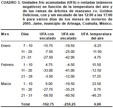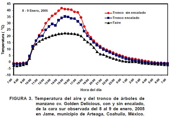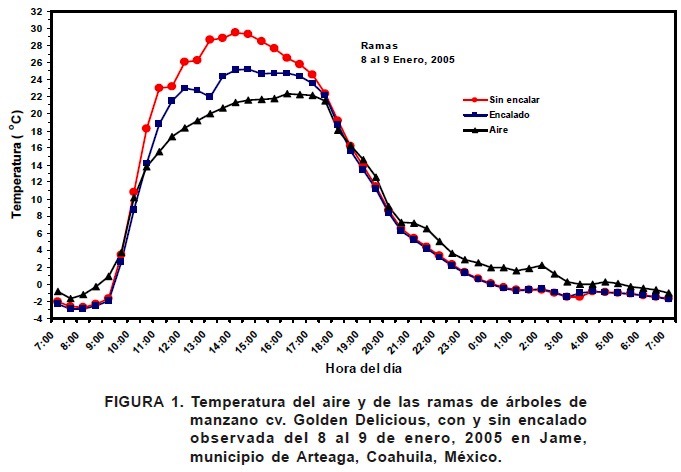 Si las temperaturas fluctúan considerablemente durante el día y la noche en el período de letargo, se contrarrestan las UF acumuladas, mientras que una continuidad de las temperaturas bajas favorece la acumulación de frío (Del-Real-Laborde et al., 1990; Young, 1992). Estas condiciones climáticas ocurren en las huertas establecidas en el municipio de Arteaga y la mayoría de las regiones manzaneras del Norte de México, donde se presentan noches frías y días cálidos y soleados que ocasionan calentamiento de los árboles y consecuentemente un efecto negativo en la acumulación de UF. El calentamiento mayor de los árboles ocurre de las 12:00 a las 17:00 h del día, debido a la mayor incidencia de radiación solar.