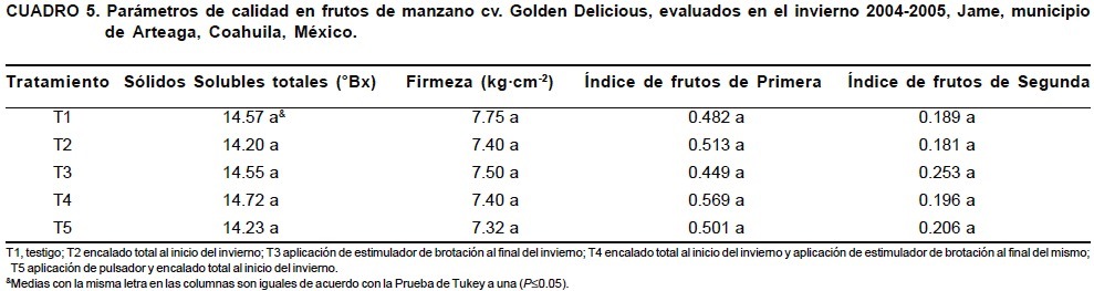 El menor rendimiento de frutos por árbol con la aplicación de TDZ, probablemente se debió a que los árboles no habían acumulado las suficientes unidades frío para responder al estimulo del producto, o que el estado de las yemas o las condiciones climáticas del invierno no fueron adecuadas para el efecto deseable del mismo. Por ejemplo, Talaminido-Amarante et al. (2002) reportaron que la aplicación de TDZ no tuvo efecto en el rendimiento de fruto de los cultivares Gala y Fuji. Mientras que Talaminido-Amarante et al. (2003) encontraron que la aplicación de TDZ afecta la calidad del fruto reduciendo la superficie roja del fruto en los cultivares Gala y Fuji, y los sólidos solubles totales en el cv. Gala.