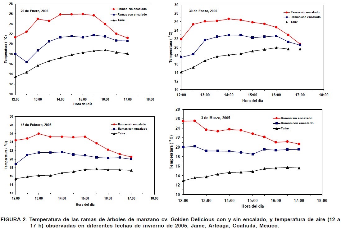 En las horas de máxima incidencia de radiación solar (12 a 17 h), la temperatura interna de las ramas encaladas fue hasta 4 °C menor que la temperatura interna de las ramas sin encalar (Figura 1). Durante la noche, la temperatura de las ramas con y sin encalado fueron iguales y hasta 2 °C menores que la temperatura del aire (Figura 1). Patrones similares se observaron en otras fechas en el transcurso de los meses de invierno 2004-2005, en donde a las horas de mayor incidencia de radiación, siempre la temperatura de las ramas encaladas fue menor que la de las ramas sin encalado (Figura 2). Al respecto, Hernández-Herrera et al. (2006) encontraron diferencias de hasta 5 °C de temperatura entre las ramas encaladas y sin encalar. Las altas temperaturas a que están expuestos los árboles durante los días cálidos del invierno tienen un efecto negativo en la acumulación de unidades frío (Young, 1992).
