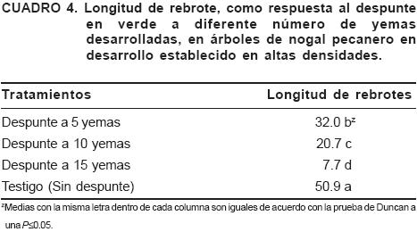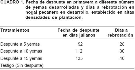 El despunte en verde disminuyó la longitud de nuevos rebrotes emergidos comparados con los brotes sin tratar (Cuadro 4). Una disminución del 38 y 60 % respectivamente en la longitud se observó en los brotes despuntados a 5 y 10 yemas desarrolladas con relación al testigo, sin despuntar. La disminución más notable (84 %) del crecimiento de los rebrotes se observó cuando el despunte se realizó a 15 yemas desarrolladas. El despunte, inmediato a la brotación (5 yemas desarrolladas) tuvo un período mayor de condiciones propicias para el crecimiento del rebrote de 20 y 43 días, en comparación con los tratamientos de despunte a 10 y 15 yemas desarrolladas. Situación que favoreció un mayor crecimiento del rebrote. Por otro lado, con el avance de la estación, la respuesta del brote al despunte pudo ser menos efectivo, posiblemente, a una disminución de los carbohidratos almacenados, lo cual puede ser soportado por el retraso en la respuesta a la rebrotación, después de los tratamientos efectuados. El despunte en verde, al reducir significativamente la longitud de los brotes nuevos, puede convertirse en una herramienta potencial para lograr compactar la copa, durante la etapa juvenil del nogal pecanero. La inducción de laterales con longitud de 32 y 21 cm, como resultado del despunte a 5 y 10 yemas desarrolladas, pone de manifiesto, el potencial para una fructificación prematura, ya que la diferenciación floral ocurre en brotes que crecen máximo 40 cm, como se reporta en un estudio anterior. Estos resultados indican que es factible el establecimiento de sistemas de producción intensiva en esta especie mientras que no se disponga de materiales enanizantes, cualquier actividad que vaya enfocada a disminuir el vigor de los brotes apicales, ya sea mediante podas en verde, así como el uso de sustancias químicas inhibidoras del crecimiento o la combinación de éstas, incluyendo otras practicas de manejo, es factible de llevarse a cabo; además se debe tomar en cuenta la viabilidad económica de estas prácticas cuando se deseen aplicar comercialmente para beneficio del productor.
