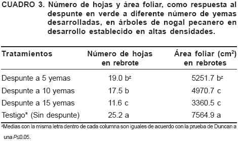 El despunte disminuyó el número de hojas en comparación con el testigo (Cuadro 3). El despunte a 5 y 10 yemas desarrolladas tuvo un efecto similar en la disminución en está variable. El menor número de hojas (11.59) se observó en el tratamiento de despunte a 15 yemas desarrolladas. Tomando en consideración que el crecimiento estacional es afectado positivamente por el follaje desarrollado en la copa; es conveniente tener presente que conforme incrementa el número de hojas, se tendrá una mejor disposición de carbohidratos, hasta una densidad foliar dada (1.5 m2 de área foliar por metro cúbico de copa) según lo sugieren las observaciones efectuadas, después de esto la eficiencia de las mismas disminuye considerablemente, debido al sombreo causado por el desarrollo foliar de la copa. De lo anterior se puede deducir que la menor cantidad de hojas en brotes despuntados puede optimizar el área foliar en estos laterales cortos, disminuyendo el sombreo y aumentando la eficiencia fotosintética.