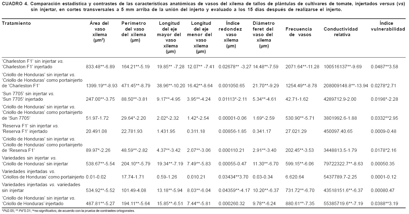 Los valores de las mismas variables analizadas anteriormente, al comparar las plántulas injertadas contra las no injertadas, indican que cuando los valores de t son positivos (Cuadro 4), significa que los valores son mayores para los tratamientos sin injertar, en tanto que si los valores son negativos, entonces los valores son mejores para los tratamientos en donde se realizó el injerto. Por lo anterior, los datos mostraron que para las variables área, perímetro, longitud del eje mayor y menor de vasos del xilema y variables derivadas de éstas, se encontró que fue significativamente mayor el tamaño de los vasos del xilema al injertarlas con el portainjerto 'Criollo de Honduras', lo que significa que fue mejor realizar los injertos en 'Charleston F1' y 'Sun 7705', no así para 'Reseva F1', que sus valores no presentaron un nivel estadísticamente significativo, es decir, sin cambios al realizar los injertos. También se incrementaron los valores de las mismas variables en los portainjertos de las variedades injertadas, y altamente significativos en 'Charleston F1' y 'Reserva F1', y sólo significativamente mejor en 'Sun 7705'.