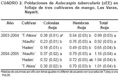 Densidad de poblaciones en follaje de los cultivares de mango. En ambos años, se detectaron diferencias significativas entre cultivares en el promedio de colonias y de hembras. En el primer año, estadísticamente (P=0.0001) el número mayor de colonias se registró en 'Tommy Atkins' (0.38/hoja) seguido de 'Ataulfo' y 'Haden'; en cambio, el mayor número de hembras (P=0.0001) ocurrió en 'Ataulfo' (0.76/hoja) respecto a 'Tommy Atkins' o 'Haden'. La suma de colonias más hembras fue también mayor (P=0.0001) en 'Tommy Atkins' y 'Ataulfo' que en 'Haden' (Cuadro 2). En el segundo año (20042005), el promedio significativamente más alto (P=0.01) de colonias (0.37/hoja) y el de hembras (0.79/hoja) se registró en (P=0.0001) 'Ataulfo'. La suma de ambas fue también más alta en este cultivar (Cuadro 2). Los resultados indican que las tres variedades fueron susceptibles a la escama. Las diferentes poblaciones entre 'Ataulfo' y 'Haden' se podrían deber al efecto de cultivar ya que ambos recibieron el mismo manejo al ser lotes de mango del mismo productor.