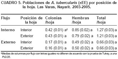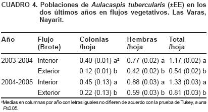 El patrón de crecimiento de A. tubercularis mostró tres etapas principales: una de baja población desde el final de las lluvias (septiembre) hasta enero. Otra fase fue de incremento poblacional (hasta 2.1 colonias más hembras/hoja) de marzo a julio y la tercera de drástica caída y bajas poblaciones durante las lluvias de julioagosto.