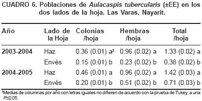 Fluctuación poblacional de la escama blanca. Se estableció un experimento en huertos comerciales de mango en las cercanías de Las Varas, municipio de Compostela, Nayarit. Se monitorearon las poblaciones de la escama blanca durante dos años, de 2003 a 2005, en tres huertos de mango de los cultivares 'Ataulfo', 'Haden' y 'Tommy Atkins'. En el primer año de estudio se monitoreó la población de la escama de agosto de 2003 a julio de 2004 y en esos mismos meses en 2004 a 2005. El monitoreo de las poblaciones se hizo aproximadamente cada 10 días. De cada cultivar se seleccionaron cinco árboles de mango de características similares, a los cuales se les marcaron cuatro ramas (orientadas a cada punto cardinal). En cada rama se marcaron dos flujos vegetativos (brotes): el flujo interno (penúltimo) y el externo (último brote). De cada flujo se marcaron dos hojas, una hoja situada en el interior y otra en el exterior del brote, lo que totalizó 16 hojas/árbol por muestreo. En cada muestreo se anotó el número de colonias (que la forman sólo machos) y hembras localizadas en el haz y en el envés de las hojas.