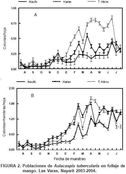 Fluctuación poblacional de escamas en follaje. En el primer año de monitoreo de la plaga (200304), se detectaron diferencias significativas (P=0.0001 en todos los casos) entre fechas de muestreo en el número de colonias y del total de escamas (colonias más hembras), en los tres cultivares de mango (Figuras 2A y 2B). El promedio más alto de colonias por hoja (0.81) se registró en mango 'Tommy Atkins' el 25 de mayo y el más bajo (0.02) en 'Ataulfo' el 20 de agosto. El valor total (colonias más hembras/hoja) más alto (2.09) se registró también en 'Tommy Atkins' el 19 de marzo, y el valor más bajo se registró en ese mismo cultivar el 1 de octubre (Figuras 2A y 2B).