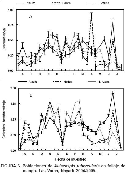 En el segundo año de monitoreo de la plaga (20042005) también se detectaron diferencias significativas (P=0.0001 en todos los casos) entre fechas de muestreo, para número de colonias/hoja y de colonias más hembras/ hoja en el follaje de los tres cultivares estudiados (Figuras 3A y 3B). El promedio más alto de colonias/hoja (0.85) se registró en 'Haden' el 20 de abril de 2005 y el más bajo (0.01) en 'Tommy Atkins' y en 'Ataulfo' el 27 de agosto de 2005. El valor más alto (2.2) del total de escamas (colonias más hembras) se registró el 5 de julio de 2005 y el más bajo (0.03) en 'Haden' el 3 de enero de 2005 (Figuras 3A y 3B).