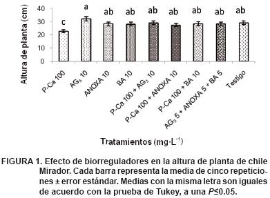 El efecto de los biorreguladores en la altura de la planta de chile Mirador se ilustra en la Figura 1. El tratamiento PCa 100 mg·L1 redujo significativamente (P<0.05) la altura de las plantas al compararse con el resto de los tratamientos. El efecto observado de PCa sobre la reducción en la altura de las plantas de chile Mirador concuerda con lo reportado por Ramírez et al. (2005) en tomate saladette. Esta reducción en altura, pudo estar directamente relacionado con un bloqueo por parte de PCa en la biosíntesis de giberelinas biológicamente activas como ha sido reportado por Rademacher (2004) y Ramírez et al. (2008). El resto de los tratamientos mostraron similitud al testigo. La concentración de AG3, ANOXA y BA utilizados no fueron suficientes para alterar ese fenotipo. Dosis superiores a 50 mg·L1 de estos reguladores se requieren para aumentar la altura de planta de tomate (Ramírez, 2003). Cuando PCa se combinó con AG3, ANOXA o BA no se observó reducción en altura. Es posible que estos biorreguladores evitaran la acción retardante del primero. Esto ha sido observado en manzano, cerezo y duraznero cuando PCa se mezcló con estimulantes del crecimiento en dosis menores a 50 mg·L1 (Rademacher, 2004).