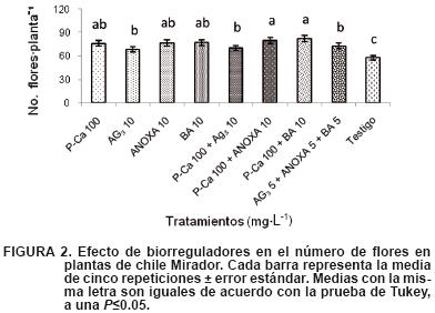La Figura 2 muestra el efecto de los biorreguladores en el número total de flores. Los tratamientos PCa 100 mg·L1, ANOXA 10 mg·L1 y BA 10 mg·L1 individual o combinados incrementaron significativamente (P<0.05) el número de flores por planta. Resultados similares han sido reportados por Dahal et al. (2006) y Chaudhary et al. (2006) en chile. Ramírez et al. (2003) demostraron en manzano que PCa aumenta el contenido de citocininas en yemas meristemáticas las cuales posteriormente se transforman en florales. Rademacher (2000) logró aumentar el número de flores en cerezo cuando aplicó PCa a dosis de 175 mg·L1; mientras que Costa et al. (2004) observaron efectos similares en peral. Con base en lo anterior, es probable que exista un sinergismo entre PCa y las citocininas aplicadas que resultan en un mayor número de flores por planta. La influencia de ANOXA y AG3 en el aumento de flores en chile ha sido previamente observado por Kamara (2001) cuando estos biorreguladores se aplican en dosis menores a 15 mg·L1. A pesar que este efecto es consistente (Evans et al., 1999), su mecanismo de acción en chile y otras especies hortícolas es aún desconocido (Owens y Stover, 1999).