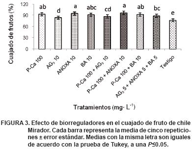 Los efectos de los biorreguladores en el cuajado de frutos de chile Mirador se ilustran en la Figura 3. Se observó que al aplicar PCa 100 mg·L1, ANOXA 10 mg·L1 y BA 10 mg·L1 individual o combinados aumentaron significativamente (P<0.05) el porcentaje de cuajado de fruto. Efectos similares reportaron RamírezLuna et al. (2005) y Sridhar et al. (2009) cuando aplicaron estos biorreguladores en chile habanero y en chile pimiento, respectivamente. El aumento en el cuajado de fruto en varios cultivos hortícolas se liga a un equilibrio entre auxinas, giberelinas y citocininas endógenas en ese órgano (Ramírez, 2003). La aplicación exógena de AG3, ANOXA y BA contribuye substancialmente a aumentar el porcentaje en el cuajado de fruto en manzano, cerezo, peral y duraznero (Rademacher, 2000). Por otro lado, PCa retarda el crecimiento vegetativo y modifica la traslocación de asimilados hacia frutos en desarrollo originando con esto mayor cuajado de frutos en tomate y manzano (Costa et al., 2004; Ramírez et al., 2005). PCa induce aumento de citocininas y auxinas en ápices, las cuales posteriormente son traslocadas a tejidos en desarrollo como frutos (Ramírez et al., 2003). Con base en esos reportes y lo observado en este trabajo, es probable que PCa y el resto de biorreguladores actúen en sinergía y con ello estimulen el aumento en el cuajado del fruto (Rademacher y Kober, 2003).