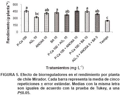 El rendimiento por planta se incrementó en todos los tratamientos con los biorreguladores (Figura 5). PCa aplicado individual o en combinación con ANOXA o BA mostraron mayor producción. Lo mismo ocurrió con BA 10 mg·L1. Estos resultados reflejan el aumento en el cuajado de fruto (Figura 3) causado por las hormonas referidas. Lo anterior se respalda con los efectos similares reportados en chile (Raviraja et al., 2008; Sridhar et al., 2009) y en tomate (Gemici et al., 2006). La producción de frutos depende de la competencia por la acumulación de fotoasimilados y su distribución en las diferentes partes de la planta (Sridhar et al., 2009). La respuesta de la planta a la aplicación de biorreguladores respecto a su producción de fruto, puede referirse en primera instancia a su contenido de auxinas, giberelinas y citocininas, las primeras por la disminución de las zonas de abscisión de los frutos, las segundas provocan una expansión celular y las terceras un aumento en la división celular (Salisbury y Ross, 1996; RamírezLuna et al., 2005). En tomate se ha reportado un aumento sustancial en el rendimiento por planta cuando se aplicó PCa a dosis de 175 mg·L1 (Ramírez et al., 2005).