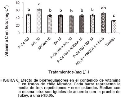 En relación al efecto de los biorreguladores en el contenido de vitamina C en frutos (Figura 6), se observó que AG3 10 mg·L1 y la combinación de AG3 5 mg·L1 + ANOXA 5 mg·LJ + BA 5 mg·L1 incrementaron significativamente (P<0.05) el contenido de este antioxidante. Los tratamientos PCa 100 mg·L1, ANOXA 10 mg·L1, BA 10 mg·L1 individual o combinado también aumentaron significativamente (P<0.05) el contenido de vitamina C. La vitamina C es un antioxidante que contribuye a una buena salud en el humano y también fortalece el sistema de protección contra enfermedades como el cáncer, diabetes y presión arterial (CruzPérez et al., 2007). Por lo tanto, aumentos de vitamina C en frutos de especies hortícolas se considera una alternativa importante en la tecnología moderna (Ramírez, 2003). El aumento del ácido ascórbico observado en este estudio con los tratamientos hormonales se fortalece con previos reportes de efectos similares encontrados en chile y tomate con aplicaciones de AG3, ANOXA, BA y PCa (Gil et al., 2004; Dahal et al., 2006; Sridhar et al., 2009). El mecanismo de acción de estos biorreguladores en el proceso referido es limitado; sin embargo, se ha propuesto que los biorreguladores empleados podrían estar estimulando una mayor intensidad en la oxidación de la enzima ácido ascórbico oxidasa y por ende mayor síntesis de vitamina C (Chaudhary et al., 2006). Con base en lo anterior, se requiere más investigación en esta línea.