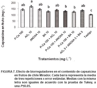 Los biorreguladores aplicados aumentaron el contenido de capsaicina en frutos de chile Mirador (Figura 7). El tratamiento con AG3 10 mg·L1 produjo el mayor incremento en este antioxidante (P<0.05), seguidos de las aplicaciones con PCa 100 mg·Li, ANOXA 10 mg·L1, PCa 100 mg·L1 + AG3 10 mg·L1y ag3 5 mg·L1+ ANOXA 5 mg·L1+ ba 5 mg·L1. En chile picante la concentración de capsaicinoides principalmente capsaicina y dihidrocapsaicina se incrementan continuamente desde el cuajado de fruto hasta su madurez fisiológica. Este proceso puede ser modificado como lo demostraron Ramírez et al. (2006) al estimular mayor contenido de capsaicina en chile jalapeño con la aplicación de PCa a 175 mg·L1. Aunque el conocimiento sobre su mecanismo de acción en este proceso no ha sido definido, ellos hipotetizaron que PCa ejerce su efecto al modificar a nivel enzimático la ruta biosintética de los flavonoides, generando flavonoides modificados ligados a la actividad antioxidante en tejidos jóvenes. Esta declaración también es sustentada con las experiencias de aplicaciones de PCa, en acelga, col, brócoli y tomate (Ramírez et al., 2007; VázquezFlota et al., 2007). El efecto de AG3, ANOXA y BA sobre el contenido de capsaicina en chile está poco documentada (Rademacher, 2004). En frutales como arándano, vid, manzano, cerezo y granado, se han reportado incrementos substanciales en la concentración de antioxidantes como antocianinas y vitamina C, cuando se aplicaron estas hormonas en niveles de 525 mg·L1 (Rademacher, 2004). Rademacher y Kober (2003) propusieron que los biorreguladores estudiados pudieron ejercer su acción al estimular cambios en el perfil de flavonoides ligados a la síntesis de los antioxidantes mencionados. Considerando esta experiencia con los resultados de este trabajo, es probable que el aumento en capsaicina ocasionado con los tratamientos con biorreguladores (Figura 7) pudiera haber tenido una ruta de acción similar. Por lo tanto se requiere investigar más este tema.