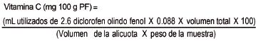 El contenido de vitamina C en frutos se determinó con el método reportado por Padayatt et al. (2001). Se maceró 1 mg con 10 ml de ácido clorhídrico al 2% (v/v). Se homogeneizó la mezcla en 40 ml de agua destilada. Se filtró a través de gasa y se colectó en un matraz Erlenmeyer. Se tomaron 10 ml del sobrenadante y se titularon con 2,6 diclorofenolindofenol (1X103 N), cuando la solución alcanzó un color rosa. El contenido de vitamina C se determinó utilizando la siguiente fórmula descrita por los autores del método referido: