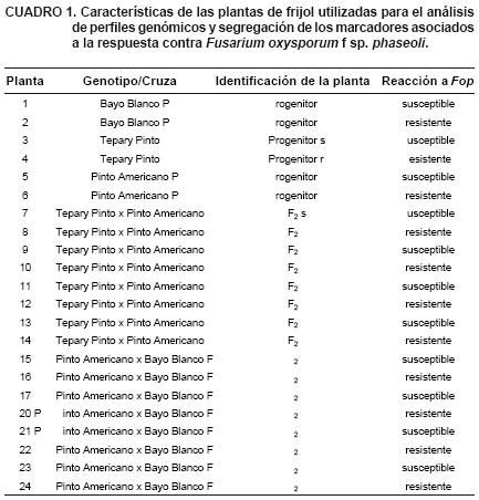 Para detectar los marcadores moleculares asociados a resistencia y/o susceptibilidad a Fop en los progenitores y en las progenies segregantes F2 de frijol, se inocularon 10 semillas de cada progenitor y 10 semillas de las progenies F2 por inmersión durante cinco minutos en una suspensión de 2.5 x 105 conidios·mL1 de Fop. Después se sembraron en macetas de un kilogramo bajo condiciones de invernadero con temperatura de 2023 °C. La selección de muestras de plantas susceptibles y resistentes se realizó 25 días después de la inoculación, con base en la presencia de síntomas de marchitamiento u hojas simples cloróticas y plantas sin síntomas de marchitez, respectivamente; su DNA se analizó de acuerdo a su polimorfismo mediante la técnica DAFPCR.