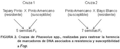 Con la finalidad de rastrear las huellas de DNA asociadas a resistencia y susceptibilidad a Fop, se realizaron dos cruzamientos, uno de Tepary Pinto (T) x Pinto Americano (P) y otro de Pinto Americano (P) x Bayo Blanco (B). Las variedades Tepary Pinto y Bayo Blanco se consideraron como resistentes y Pinto Americano como susceptible, con base en las respuestas que mostraron en la evaluación indicada en la Figura 1. En los progenitores y las progenies F2 de las cruzas, se analizó la herencia del marcador de DNA asociado al nivel de resistencia. Las cruzas se representan en el esquema siguiente: