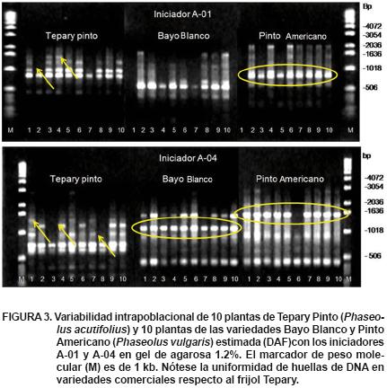 Los perfiles de DNA observados en las plantas representantes de los progenitores Pinto Americano y Bayo Blanco a través de las huellas DAF, indicaron que el grado de variación intrapoblacional fue bastante estable en comparación con el progenitor Tepary Pinto, que presentó perfiles heterogéneos entre las plantas analizadas. Este comportamiento en las variedades probablemente se debe, en primer lugar, al alto nivel de endogamia característica del género Phaseolus, y en segundo lugar, lo que era de esperarse, a que son variedades comerciales cuyo origen se remonta a una sola planta obtenida después de muchas generaciones mediante autofecundación (líneas puras). El frijol Tepary a diferencia de las variedades comerciales, en México se considera como silvestre, por lo que es muy variable. En la Figura 3 se muestran perfiles DAF obtenidos con los iniciadores utilizados A01 y el A04. Nótese que las variedades Bayo Blanco y Pinto Americano presentan bandas de DNA comunes con ambos iniciadores (elipses), mientras que los representantes de Tepary Pinto exhiben mayor variación en los perfiles (flechas).