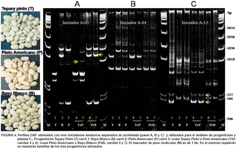Los perfiles genómicos tipo DAF demostraron que las progenies F1 contenían material genético de los progenitores utilizados en las cruzas respectivas, tal como se observa en la Figura 4. Para la evaluación de las progenies se utilizó la mezcla de DNA de todas las plantas F1 obtenidas en cada cruzamiento. En la cruza de Tepary Pinto x Pinto Americano (panel A, carril 5) se aprecia un fragmento de DNA de alrededor de 1,010 bp señalado con una flecha, que posiblemente se deba a una nueva recombinación genética ocurrida en la cruza. En los carriles 6 y 7 del panel A correspondientes a la cruza Pinto Americano x Bayo Blanco, existe una banda de aproximadamente 1,220 bp perfectamente definida (señalada con una flecha) heredada del progenitor Bayo Blanco (carril 2). En el panel B no se observaron fragmentos nuevos heredados a la progenie F1. Con el iniciador A13 (panel C) se observaron dos bandas de alrededor de 490 bp y 520 bp en los carriles 4 y 5 (señalados con flechas) en la cruza cruza T x P claramente heredadas del progenitor Tepary.