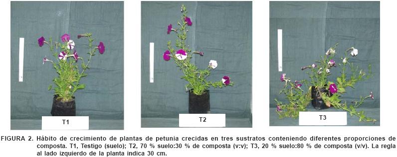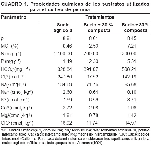 La petunia es una planta ornamental perteneciente a la familia Solanaceae. Su centro de origen y diversidad genética se ubican en Sudamérica, y la mayor parte de los ejemplares comerciales son híbridos (Petunia x hybrida). Es una herbácea anual que muestra periodos de floración prolongados en suelos bien drenados y con suficiente humedad y es tolerante a la salinidad (Fornes et al., 2007). El sustrato que normalmente se utiliza para la siembra y desarrollo de esta especie es la turba, cuya importación está haciendo su cultivo cada vez menos rentable, por lo que es necesario evaluar el uso de sustratos alternativos a fin de lograr una producción sustentable. En este sentido se han reportado resultados positivos con el uso de compostas como sustrato para esta especie, las cuales se han elaborado con materiales tan diversos como la corteza de pino (Deulofeu yAguila, 1984), pulpa de arándano (Cox y Lopes, 2007) y estiércol (Chamani et al., 2008). La composta se produce por un proceso biooxidativo controlado en el que intervienen microorganismos que requieren humedad adecuada y sustratos orgánicos heterogéneos en su composición pero homogéneos en su tamaño. Al final de una fase termófila se obtienen nutrimentos, materia orgánica estabilizada e higiénica, rica en poblaciones microbianas benéficas para la planta, ácidos húmicos y fúlvicos y bioactivadores de la fisiología vegetal (Capistrán et al., 2001). Dede et al. (2006) reportaron que la menor tasa de crecimiento en Impatiens wallerana se obtuvo con la turba comercial, mientras que la más alta fue obtenida con una mezcla de turba con composta de rastrojo de maíz procesado y pollinaza. Estos resultados sugieren que es posible utilizar sustratos orgánicos como medios de crecimiento alternativo para sustituir la turba. Fain et al. (2008) observaron que la madera de desecho en combinación con turba, puede ser un sustrato alternativo para el cultivo de petunia. Es importante considerar que las compostas presentan valores de pH clasificados de ligeramente alcalinos a alcalinos, los que se relacionan de forma inversa con la disponibilidad de micronutrimentos (Handreck y Black, 2002).