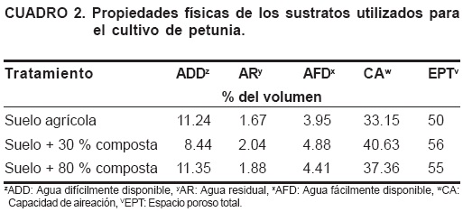 Los tratamientos evaluados fueron: suelo agrícola del sitio experimental (T1), empleado como testigo en esta investigación; mezcla de suelo agrícola con 30 % de composta (T2); mezcla de suelo agrícola con 80 % de composta (T3). La composta fue preparada con estiércol de ganado bovino y residuos vegetales de huertos de traspatio. Algunas de las propiedades químicas y físicas (estimadas con el software Sdemo) de estos sustratos se presentan en los Cuadros 1 y 2.