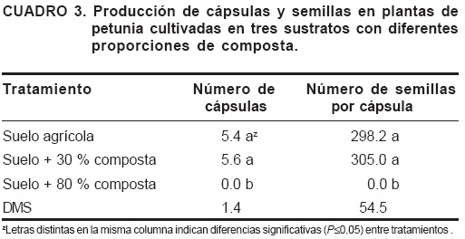 El porcentaje de composta en el sustrato afectó significativamente la producción de cápsulas y de semillas por cápsula en esta especie (Cuadro 3). Se observó que en el tratamiento testigo (suelo agrícola) y con la adición del 30 % de composta al sustrato, se logró producir un promedio de 5.6 cápsulas y 305 semillas por cápsula, en tanto que cuando las plantas crecieron en sustrato con 80 % de composta no se presentó producción de semillas.
