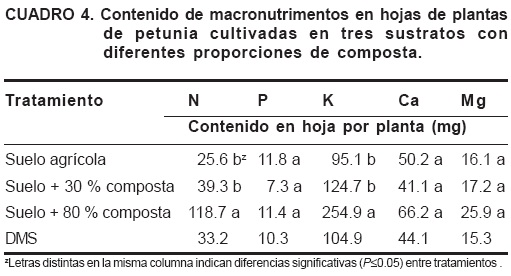 El contenido de macronutrimentos en hoja se muestra en el Cuadro 4. Se puede observar que el tratamiento con 80 % de composta presentó los valores más elevados de N y K en este órgano de la planta. Sin embargo, los tratamientos no presentaron diferencias significativas en cuanto al contenido de P, Ca y Mg.