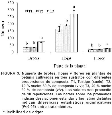 El número de hojas fue superior en las plantas tratadas con 80 % de composta (271.2 hojas·planta1) en comparación con el obtenido con los otros dos tratamientos (191.8 hojas·planta1 para 30 % de composta y 163.8 hojas·planta1 para el testigo). El mayor número de brotes también se presentó en el tratamiento con 80 % de composta (72.6 brotes·planta1). De igual manera, en el caso de las flores, el mayor número se registró en plantas que crecieron en el sustrato conteniendo 80 % de composta (27.2 flores·planta1); los otros dos tratamientos produjeron un número muy similar de flores por planta (16.2 y 16.6, respectivamente) (Figura 3).