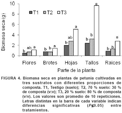 El crecimiento de las plantas de petunia varió de acuerdo al sustrato en que éstas crecieron. En el caso de las variables altura de planta y diámetro de tallo, se observó que las plantas desarrolladas en suelo agrícola y en el sustrato que contenía la menor proporción de composta crecieron erectas, mientras que las que se establecieron en sustratos con mayor proporción de composta (80 %) sufrieron acame, pese a que sus diámetros a ras del suelo fueron mayores. Esto pudo deberse al mayor peso de biomasa aérea seca que ejerció mayor peso sobre la estructura del tallo, ocasionando el acame. Este incremento en biomasa seca es debido a la mayor absorción de N y K (Cuadro 4). Estos resultados coinciden con los reportados en Hordeum maritimum L., donde se demostró que la adición de composta al suelo mitigó el efecto negativo de la salinidad (Na y Cl) sobre el crecimiento de la planta, registrándose un incremento significativo en la producción de biomasa seca asociado, principalmente, a una mayor absorción de N y en menor grado de importancia a la absorción de K (Lakhdar et al., 2008).