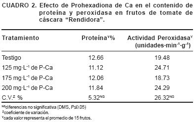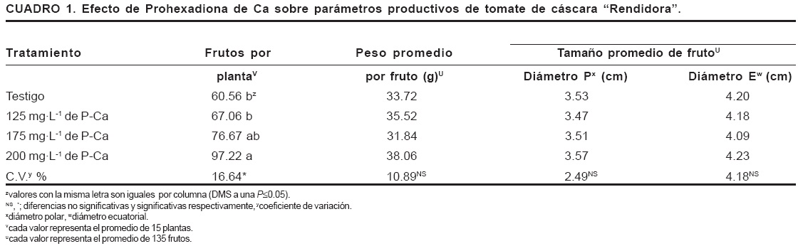 ProhexadionaCa aplicado a plantas de tomate de cáscara no afectó el tamaño de fruto (Cuadro 1). De forma importante se observó un aumentó en el número de frutos por planta sin afectar el tamaño de estos. Efectos similares reporta Dayatilake et al. (2005) en frutos de manzano al aplicar la PCa.