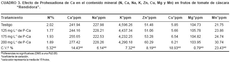 No se observaron diferencias significativas en los niveles de nutrientes entre tratamientos. Los resultados obtenidos muestran que la aplicación de prohexadionaCa no afectó el contenido mineral en frutos de tomate de cáscara "Rendidora". El flujo de minerales en plantas es variado y depende de la disponibilidad y demanda entre órganos de la planta y la etapa de desarrollo de la misma (Gutiérrez, 1997). Es posible que al reducirse el crecimiento vegetativo por la presencia de PCa en el tejido, se modifique el patrón de traslocación de minerales y éstos sean enviados en mayor proporción hacia los frutos en desarrollo y su distribución sea más equitativa entre ellos; reflejándose en lo observado el no afectarse adversamente el contenido y los niveles de los mismos (Rademacher, 2004). Los elementos minerales, son necesarios para el metabolismo de la planta, cumplen funciones como constituyentes de moléculas orgánicas, en la reserva energética, de forma iónica y reacciones redox (Raven et al., 1992). La deficiencia de minerales, se refleja principalmente en frutos, induce desórdenes fisiológicos que se traducen en bajas en el rendimiento, tamaño, peso, color, forma, sabor y calidad nutritiva en fruto (Martínez et al., 2008; Mancera et al., 2007), lo que demuestra la gran importancia de no afectar los niveles en el contenido mineral; a pesar de que son diversos los factores que pudieran influenciar en la absorción, movilidad y asimilación de los elementos minerales en la planta (Shaviv y Mikkelsen, 1993). (Cuadro 3)