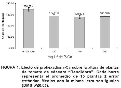 La Figura 1 muestra que ProhexadionaCa originó efectos significativos (P<0.05) en la altura de la planta de tomate de cáscara.