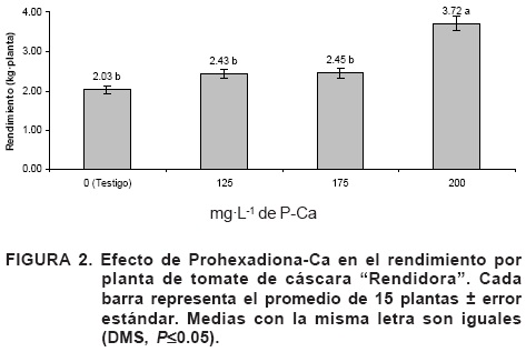 El rendimiento por planta se incrementó con ProhexadionaCa (Figura 2). En el tratamiento de 200 mg·L1 se observó una diferencia significativa (P<0.05) ante el resto de los tratamientos, con un incremento de hasta un 83 % en comparación con el testigo. En las dosis de 125 y 175 mg·L1, aunque no significativo, se observó un 19 y 20 % de aumento respectivamente. Los incrementos en el rendimiento reflejan principalmente los efectos positivos en el mayor número de frutos con la aplicación de ProhexadionaCa (Cuadro 1). Estos resultados se fortalecen con lo reportado en tomate "Saladette" al aplicar 175 y 200 mg·L1 de PCa (Ramírez et al., 2005) y en cultivos como manzano (Ramírez et al., 2006; Dayatilake et al., 2005) y pera (Costa et al., 2004).