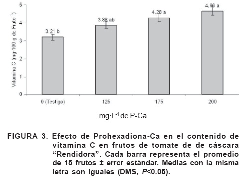 En la Figura 3 se muestran los efectos de los tratamientos en los valores de la concentración de vitamina C en frutos de tomate de cáscara. Los resultados obtenidos muestran que los tratamientos con PCa incrementaron el contenido de vitamina C en comparación con el testigo. Frutos tratados con PCa a dosis de 175 y 200 mg·L1 aumentaron de forma significativa (P<0.05) el contenido del antioxidante con un 33 y 45 %, respectivamente. La vitamina C es un antioxidante importante como elemento nutritivo para la salud humana, se le atribuye el fortalecimiento del organismo en defensa a enfermedades cardiovasculares (Carr y Frei, 1999). El aumento significativo de la vitamina C como efecto de la aplicación del retardante de crecimiento vegetativo, se puede derivar de un estímulo en la biosíntesis del ácido ascórbico sintetizado con base en la oxidación a través de la enzima oxidasa de ácido ascórbico como lo han sugerido Chaudhary et al. (2006), y Melo y Cuamatzi (2007). Se han mostrado incrementos de vitamina C con la aplicación de retardantes de crecimiento como el paclobutrazol (Jamalian et al., 2009), pero con la desventaja de que éste persiste en la planta y produce efectos tóxicos en humanos, con lo que se prohibe su uso en cultivos hortícolas (Owens y Stover, 1999). El retardante PCa no causa esos efectos adversos (Rademacher, 2004), por lo tanto, el aumento en el contenido de Vitamina C en frutos de tomate de cáscara, confirma la importancia de PCa como una alternativa en la tecnología aplicada a la horticultura moderna (Ramírez, 2003).