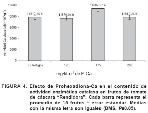La aplicación de ProhexadionaCa a plantas de tomate de cáscara indujo efectos en la actividad enzimática catalasa en frutos en proceso de maduración.