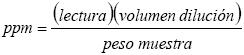 donde, v. ácido es el volumen gastado de H2SO4 (0.1N) para titular la muestra, Nác. y Nbco. es la normalidad del H2SO4 (0.1N), v. bco. es el volumen gastado de H2SO4 (0.1N) para titular el blanco. La determinación de calcio (Ca), sodio (Na), potasio (K), zinc (Zn), cobre (Cu), magnesio (Mg) y de manganeso (Mn) se realizó por el método de absorción atómica (A. O. A. C., 1980), en la cual 1 g de fruto seco y molido se incinera. Un matraz con el incinerado junto con la mezcla perclórica (ácido nítrico y ácido perclórico 3:1 (v/v)) se coloca en una estufa para la digestión hasta obtener un líquido de color claro. El digerido se filtra (con papel filtro 42 sin cenizas) a un matraz y se afora a 100 ml con agua desionizada. Se toma lectura de las muestras en el espectrofotómetro de absorción atómica. El contenido para K, se determinó con la fórmula;